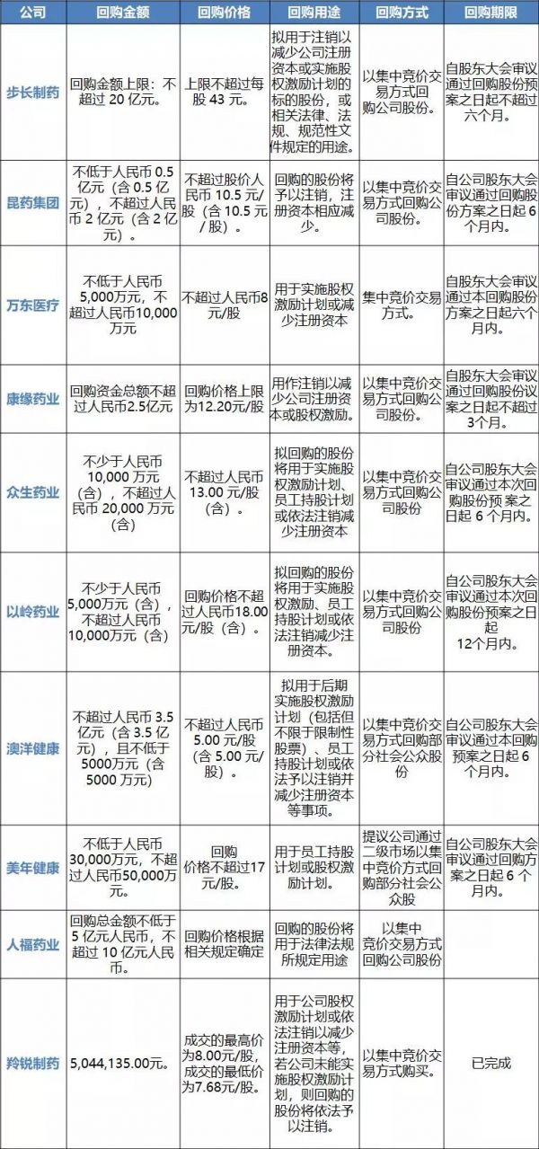 (注:步长方案已审议通过;人福、美年为提议;羚锐已回购完成;其他均为出预案)