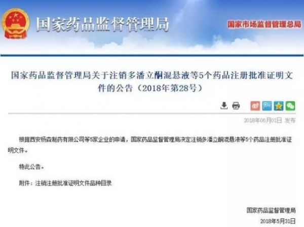2018年6月1日,国家药品监督管理局发布《关于注销多潘立酮混悬液等5个药品注册批准证明文件的公告》,宣布相关企业主动申请,艾畅、小儿吗丁啉等5药品退市注销。