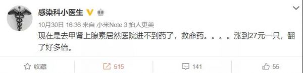 日前,微博用户 @感染科小医生发出一条微博“现在是去甲肾上腺素居然医院进不到药了,救命药……涨到 27 元一只,翻了好多倍。”
