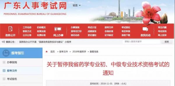 11月1日,广东人事考试网发布《关于暂停我省药学专业初、中级专业技术资格考试的通知》。