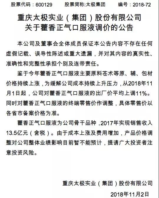 11月2日,太极集团发布《关于藿香正气口服液调价的公告》,宣布从2018年11月1日起,公司对藿香正气口服液的出厂价平均上调11%。