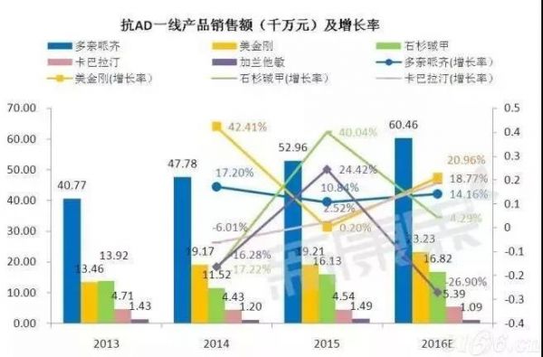 而在5个一线治疗产品中,销售势头最猛的是多奈哌齐。