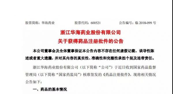 近日,浙江华海药业股份有按公司(以下简称“华海药业”)发布公告:已收到国家药品监督管理局(以下简称“国家药监局”)核准签发的《药品注册批件》。