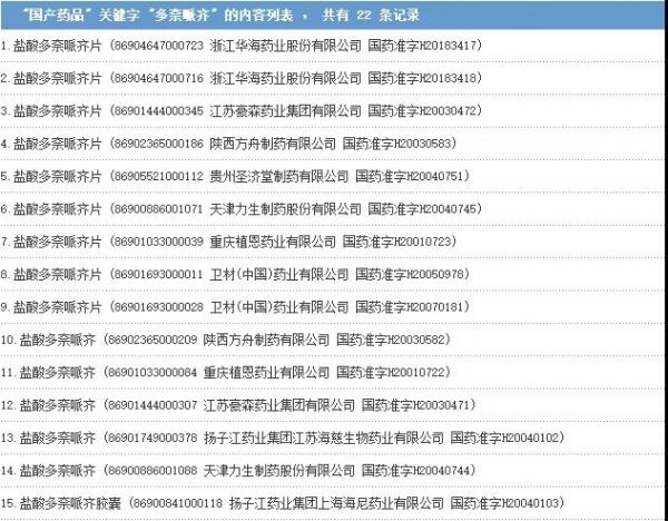 截至目前,在药监局官网查询,加上刚被批准的华海药业,目前国内已有15家企业被批准生产多奈哌齐片。