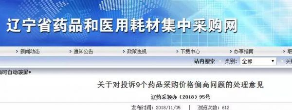 今日(11月5日),辽宁省药品和医用耗材集中采购网发布《关于对投诉9个药品采购价格偏高问题的处理意见》(以下简称《意见》),对收到的涉及8家药品生产企业生产的9个药品采购价格偏高和倒挂问题的投诉进行处理。
