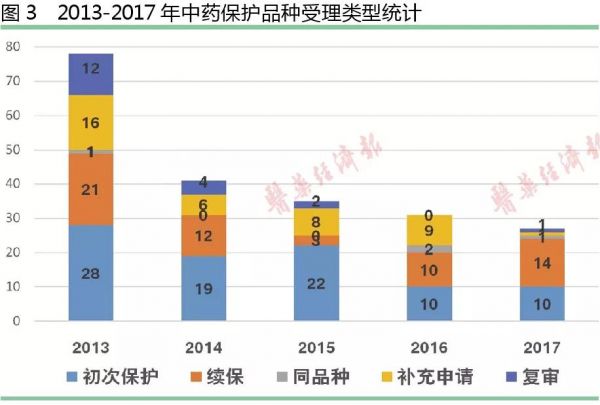 近年来药品审评审批趋严,中药保护品种受理、获批数量也在下降。2015年、2016年最低,分别仅有26个和27个中药品种被公告保护。