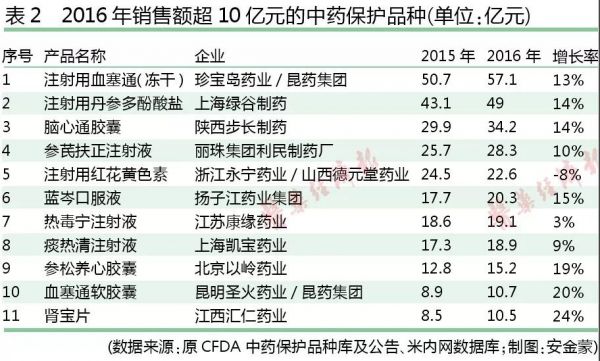 据米内网统计,2015年销售额过亿元的中药保护品种超过70个,2016年销售额超过5亿元的中药保护品种有28个,其中销售额破10亿元的产品有11个。近两年销售前10的中药保护品种中,有超过半数为注射液,且除注射用红花黄色素2016年销售额略有下降外,增长率超过10%的产品有8个,涨势喜人,说明这些具有知识产权的中药大品种在市场上的实力与潜力确实不容小觑。但2017年版国家医保目录对中药注射液增加了诸多限制,而且中药注射液再评价也如火如荼,未来销售额的表现需进一步追踪观察。