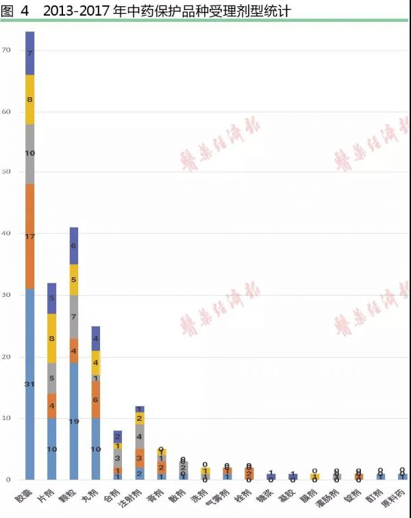 2013-2017年,主管部门共计受理中药保护申请212项,其中初次申请89项,延长保护期申请60项;涉及18种剂型,最多的为胶囊剂(73项),其次为颗粒剂(41项)、片剂(32项)。