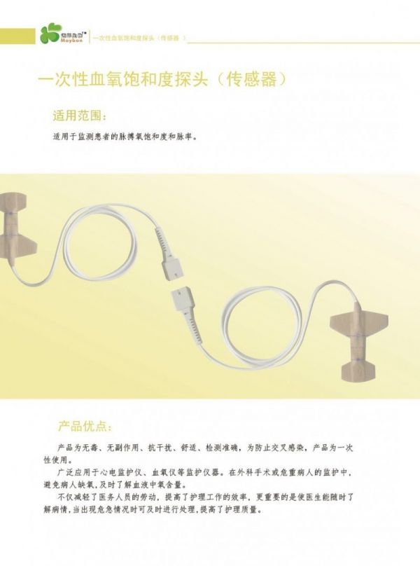 产品为无毒、无副作用的一次性使用血氧饱和度探头,杜绝交叉感染。