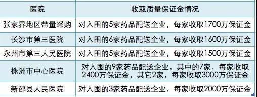 此前,据赛柏蓝报道:近些年来,湖南省一些公立医疗机构在遴选药品配送企业时,收取数额巨大的的质量保证金,是非常普遍的现象。从地区带量采购,到三甲医院,甚至县级医院,都是如此。(部分情况见下表)。