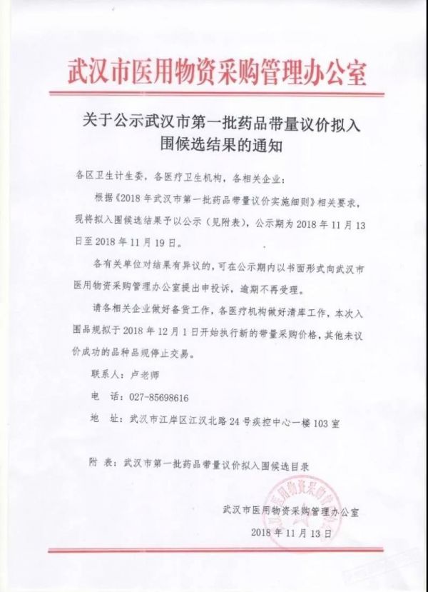 11月13日,武汉市医用物资采购管理办公室发布《关于公示武汉市第一批药品带量议价拟入围候选结果的通知》(以下简称《通知》)。