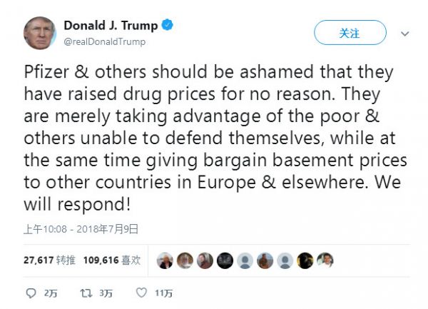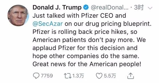 这意在回应7月9日特朗普炮轰美国药企的高定价的推特,这条推特中,特朗普专门点名辉瑞,语气激烈:辉瑞和其他制造商应该为其毫无理由的涨价行为而羞愧。