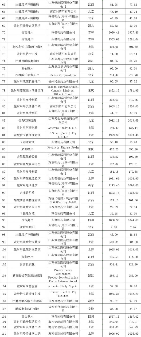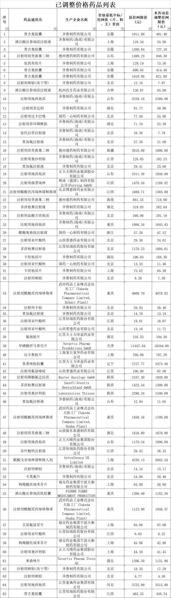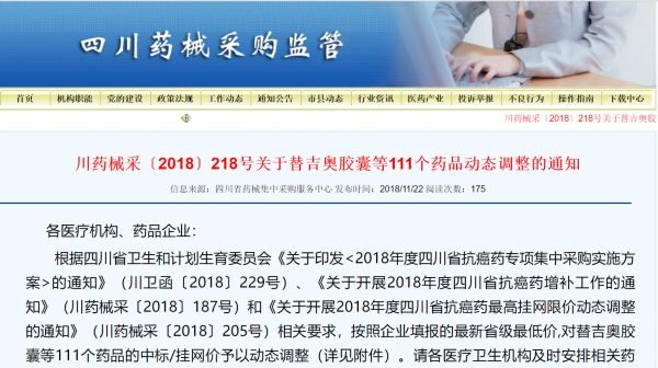 据通知,根据四川省卫生和计划生育委员会《关于印发<2018年度四川省抗癌药专项集中采购实施方案>的通知》(川卫函〔2018〕229号)、《关于开展2018年度四川省抗癌药增补工作的通知》(川药械采〔2018〕187号)和《关于开展2018年度四川省抗癌药最高挂网限价动态调整的通知》(川药械采〔2018〕205号)相关要求,按照企业填报的最新省级最低价,对替吉奥胶囊等111个药品的中标/挂网价予以动态调整。