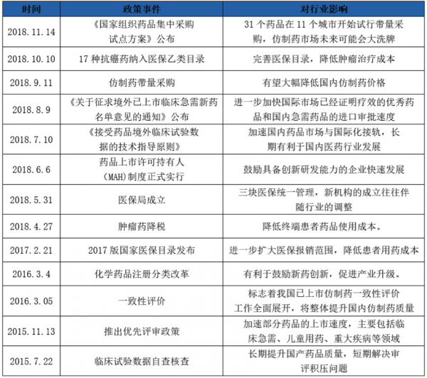 其中,新组建的医保局成立之后的第一个重磅政策“带量采购”政策于11月14日正式发布,对行业影响深远。短期对原研药或国内放量成熟品种形成较大压力,对刚获批或未放量品种的国内企业形成利好,但是对以高毛利仿制药为主要产品的上市公司有压制作用;从长期来看,必将优化国内医药市场结构,指导国内药企由仿制药向创新药逐步转型,利好创新药优势明显的企业。