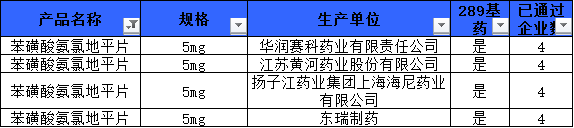 其中,东瑞制药的苯磺酸氨氯地平片是该品规第四家通过一致性评价的产品。