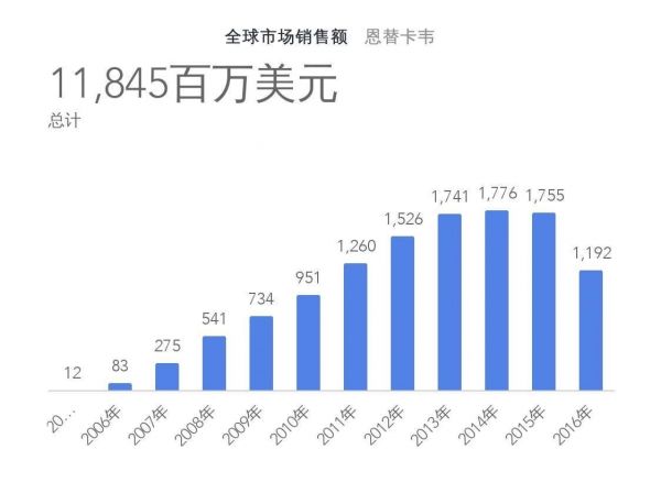 《药筛》数据显示,恩替卡韦全球市场年销售最高达到17.8亿美元(共计人民币123.8亿元),2015年后,由于仿制药、其他新药加入,市场销售额开始下降。