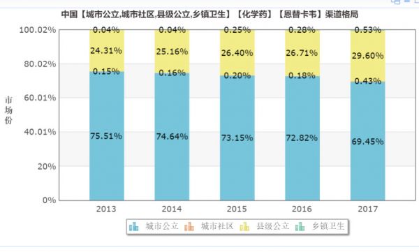 从恩替卡韦在各级医院使用情况来看,其在县级公立医院的市场占比逐渐增大。可见,在分级诊疗政策下,作为慢性乙型肝炎治疗的一线药物,其市场已经逐渐往基层下沉。