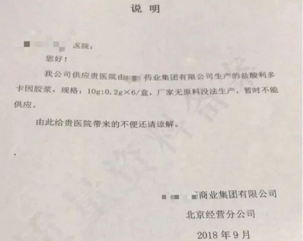 近日,一则商业公司发给医院的断货说明在业内流传。通知显示,断货的药品为盐酸利多卡因胶浆,断货原因是厂家无原料,无法生产。