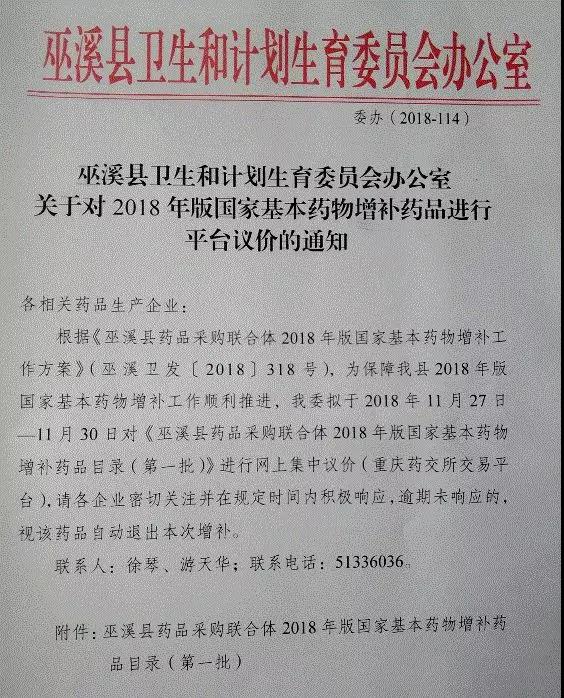 重庆药交所发布《重庆市巫溪县卫计委办公室关于对2018年版国家基本药物增补药品进行平台议价的通知》。