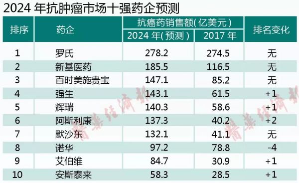 日前,市场调研机构EvaluatePharma发布了2024年抗肿瘤市场十强公司预测。乍看之下,上榜药企与2017年榜单大致相同,根据预测,去年位列前三甲的罗氏(Roche)、新基医药(Celgene)与百时美施贵宝(BMS)在6年之后将同样保持自己的优势地位。