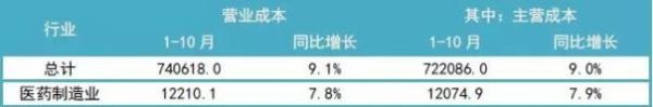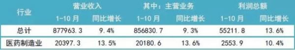 1-10月份,在41个工业大类行业中,34个行业利润总额同比增加,7个行业减少。其中,医药制造业利润总额为2553.9亿元,同比增长10.4%。