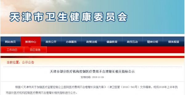 《公示》显示,根据《天津市关于加强医疗监管控制公立医院医疗费用不合理增长实施方案》的文件精神,现将2018年上半年我市部分医疗机构控制医疗费用不合理增长线管指标进行公示。
