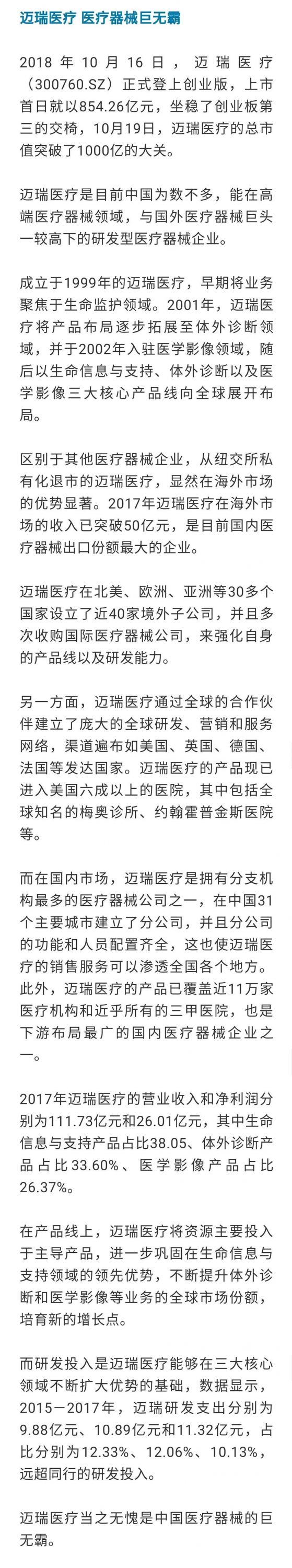 的确,迈瑞近几年不仅保持着稳定的营收增长以及持续的盈利能力,成功登陆A股市场更是为其插上有力的翅膀,总市值轻松突破千亿元的关口。