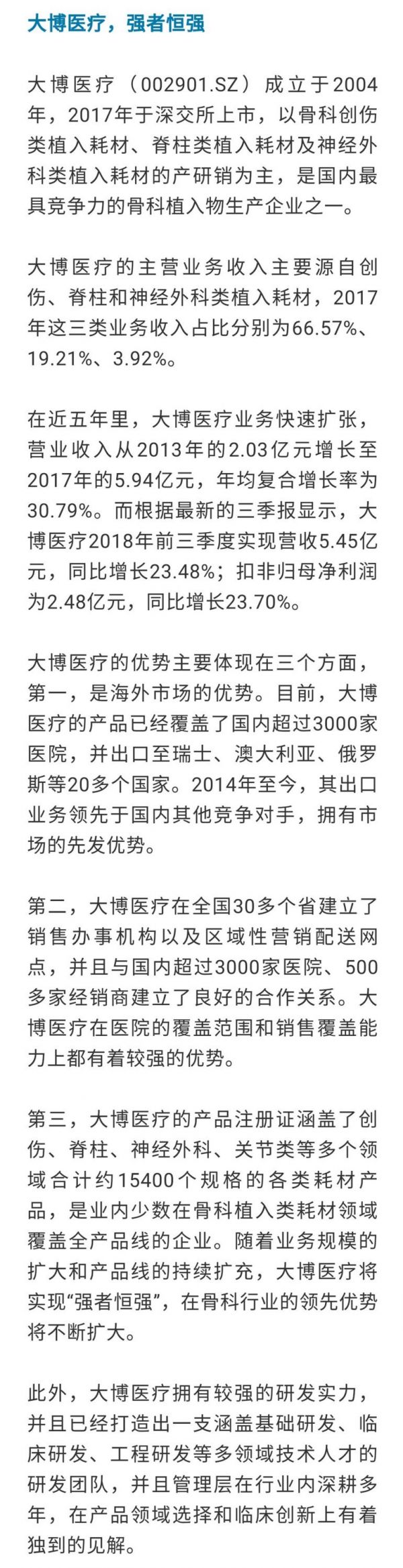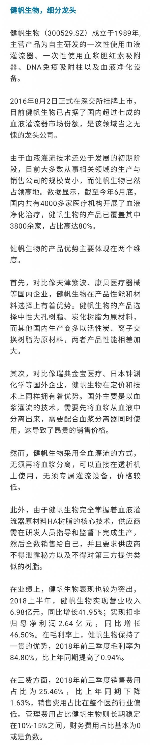 可以看到,单纯看净利润的话,位列前五的公司依次为迈瑞医疗、乐普医疗、鱼跃医疗、迪安诊断、迈克生物;而如果以2018年上半年公司毛利率排名的话,则前五位(迈瑞医疗除外)依次分别是健帆生物、大博医疗、乐普医疗、开立医疗、九强生物。2018谁最能赚钱一目了然。 以下分别说说三个公司:迈瑞医疗、健帆生物和大博医疗。
