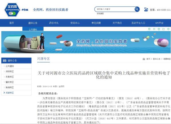 11月15日,全药网发布《关于对河源市公立医院药品跨区域联合集中采购上线品种实施首营资料电子化的通知》(以下简称《通知》),明确启动实施电子首营工作。