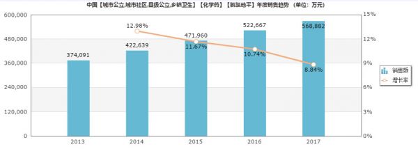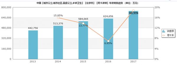 米内网数据库显示,阿莫西林胶囊的市场增长率从2014年到2016年的20%以上,下降到2017年的1.99%,增长速度大幅放缓。2017年市场规模为9.78亿元。