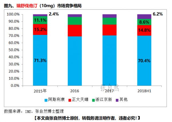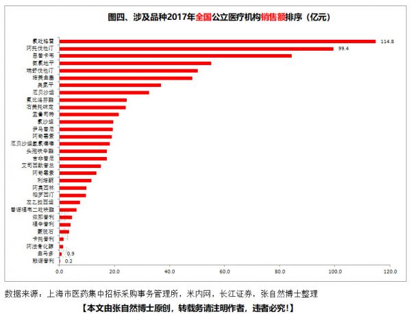 位居本次采购金额第五的是瑞舒伐他汀,尽管南京正大天晴、浙江京新、南京先声东元、浙江海正等国内多家知名药企也都早已仿制了此药,但原研阿斯利康的市场份额4年来几乎没受什么影响,仍占据7成市场(IMS百床以上医院数据),本次招采的价格竞争也会比较惨烈。