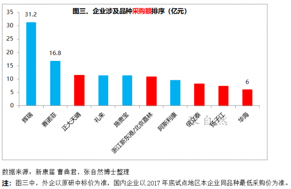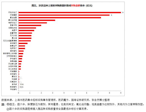 根据正式版公布的采购量,如按全国最低中标价计算,则采购总额为43.86亿元,采购金额最大的阿托伐他汀口服常释剂型的为9亿元,阿奇霉素注射剂以8亿元位居第二,卡托普利为零,赖诺普利仅100万元。