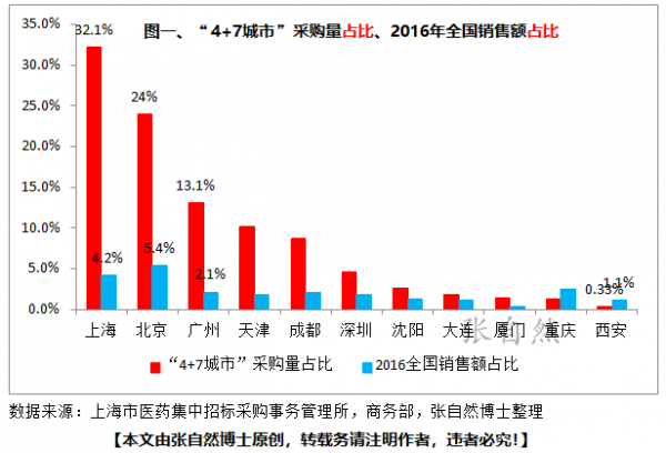 尽管这11个城市从数量上仅占全国333个地、市、州、盟的3%多一点,但其辖区的药品销售额却占了2016年全国药品销售总额的23.7%(商务部数据),且还都是消费高价进口药较多的区域中心城市,仅北上广3个城市就占了全国的11.7%。