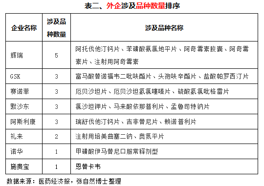 如表二所示,入围的31个品种共涉及辉瑞、GSK等8家外企,其中,辉瑞涉及品种数量最多,达5个。