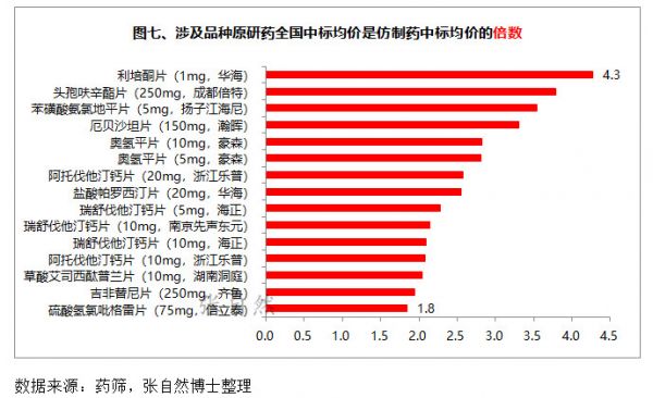 另外,以往原研药的中标价都比仿制药的要高出很多,有的甚至高出数倍,如利培酮片原研的中标价高达仿制药的4.3倍、头孢呋辛酯片原研的中标价则是仿制药的3.8倍,价差最小的硫酸氢氯吡格雷片,其原研药的中标价也达仿制药的1.8倍(图七),这就不难理解为什么官方对仿制药替代的决心如此之大了。