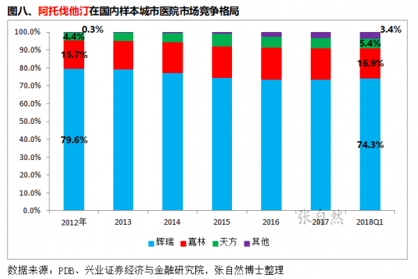 由图八可见,本次采购金额最大的品种阿托伐他汀一直由辉瑞控制市场,尽管嘉林、天方、莱柯、新东港、百科等国内药企的仿制药也已上市多年,但辉瑞的市场份额6年来仅下降了5个百分点,到今年第一季度仍占74.3%的份额(PDB数据),按本次招标规则,辉瑞的霸主地位将受到严峻挑战。