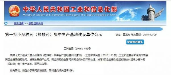 12月5日,工信部官网公示了第一批小品种药(短缺药)集中生产基地建设单位。根据《关于组织开展小品种药(短缺药)集中生产基地建设的通知》,工业和信息化部消费品司会同卫生健康委药政司、发展改革委产业司、药监局药品监管司共同组织专家评审论证,推荐3家企业牵头组建的联合体建设小品种药(短缺药)集中生产基地,分别为:上海医药集团股份有限公司牵头组建的联合体、中国医药集团有限公司牵头组建的联合体和成都倍特药业有限公司牵头组建的联合体。公示时间为12月5日-12月9日。