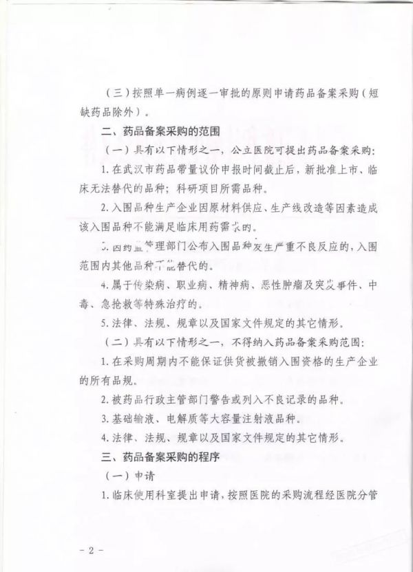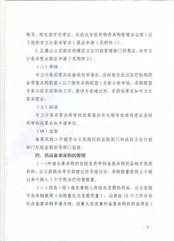 按照《通知》要求,武汉市公立医院必须在湖北省药械集中采购平台上进行药品备案采购,并按照先备案后采购的原则实施,且遵循单一病例逐一审批的原则申请备案采购(短缺药品除外)。