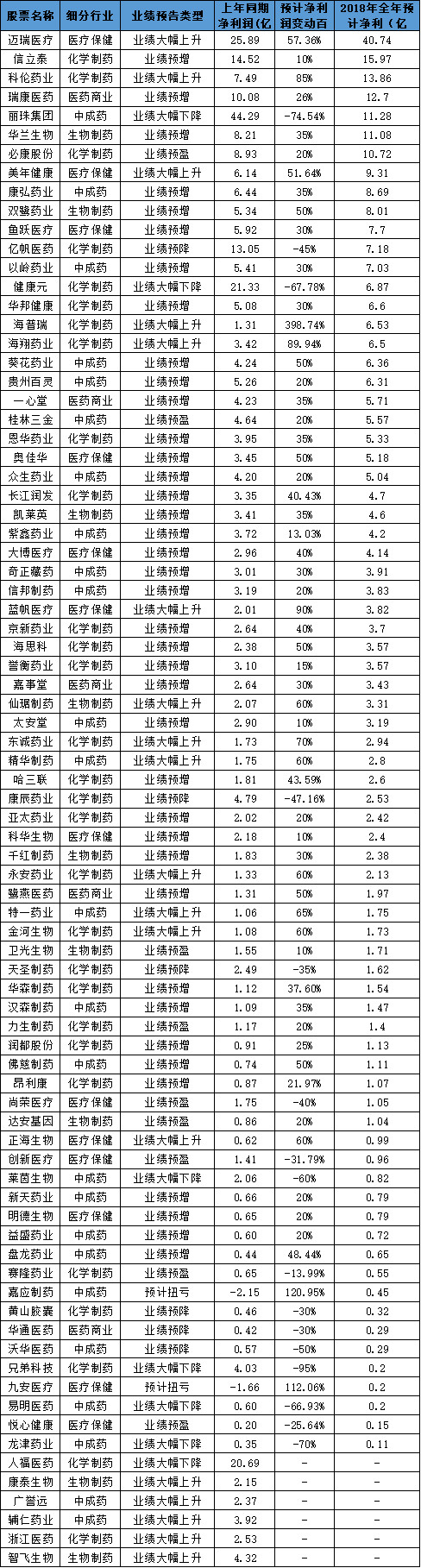 截至目前,据同花顺统计数据显示,已有91家药企(约占A股上市公司的1/3)发布了2018年全年业绩预告,其中预计亏损的企业为5家,亏损面约为5.5%,盈利的企业为81家,约为89%,不确定的企业为5家。