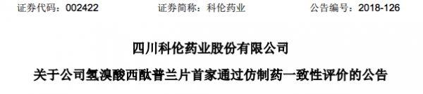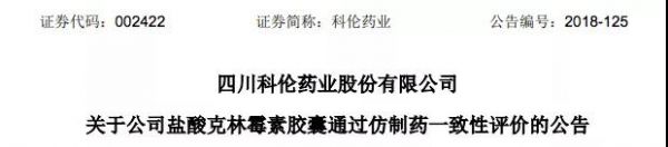 12月4日,科伦药业发布两则公告,公司生产的盐酸克林霉素胶囊(75mg、150mg)和氢溴酸西酞普兰片20mg,分别通过仿制药一致性评价。
