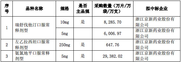 在第二天,12月7日,京新药业也发布了与一致性评价品种有关的4+7城市药品集中采购的相关通知。根据通知,12月6日,京新药业已通过一致性评价的仿制药品瑞舒伐他汀钙片、左乙拉西坦片、苯磺酸氨氯地平片,参加了4+7城市药品集中采购的投标。拟中标产品信息如下: