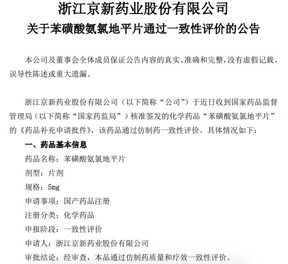12月6日,京新药业发布公告称,近日,公司生产的苯磺酸氨氯地平片5mg通过仿制药一致性评价。目前,苯磺酸氨氯地平片5mg已通过一致性评价的企业已满五家,成为通过企业最多的品种。