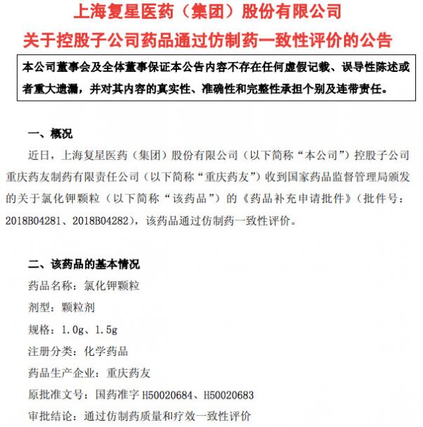 12月8日,复星医药发布公告称,其控股子公司重庆药友制药有限责任公司生产的氯化钾颗粒通过仿制药一致性评价。通过的产品为1g、1.5g两个规格,两个规格均为氯化钾制剂首家通过一致性的产品。