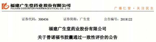12月5日,广生堂药业发布公告称,公司生产的富马酸替诺福韦二吡呋酯胶囊通过一致性评价,成为该品种第四家通过一致性评价的企业。