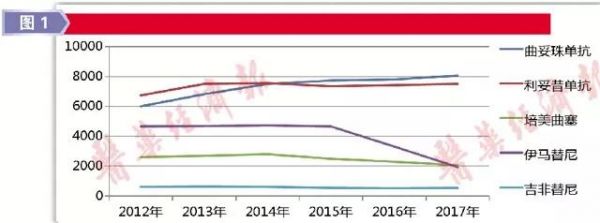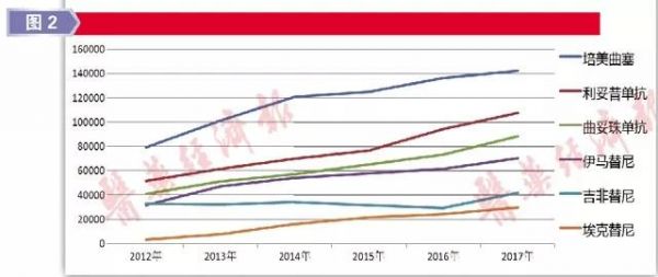 2012-2017年6种靶向肿瘤药国内样本医院市场情况(单位:万元)