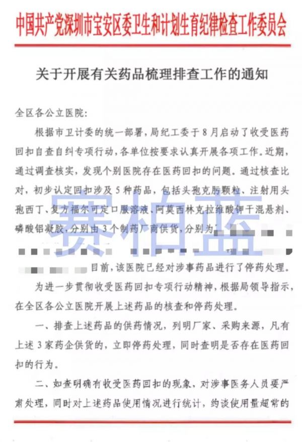 近日,有知情人士向赛柏蓝提供了一份落款为深圳市宝安区卫计纪工委的红头文件,文件标题为《关于开展有关药品梳理排查工作的通知》。