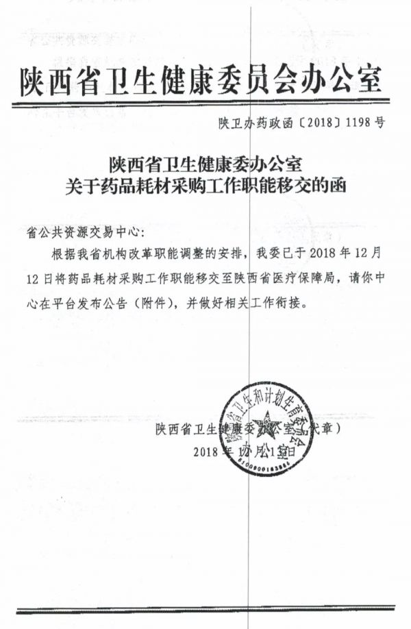 12月14日,陕西省公共资源交易中心发布《陕西省卫生健康委办公室关于药品耗材采购工作职能移交的函》的通知。这份通知显示,本月1日,陕西省卫生健康委办公室即致函陕西省公共资源交易中心,称根据陕西省机构改革职能调整的工作安排,自2018年12月12日起,陕西省药品耗材的采购工作职能开始移交给陕西省医疗保障局负责。