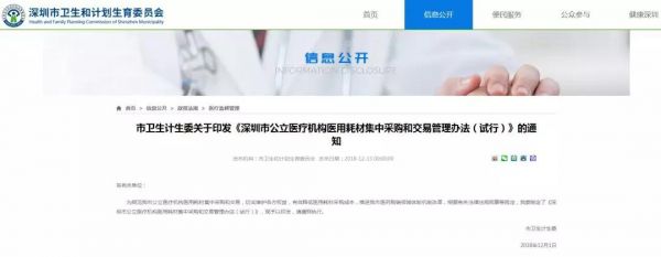 2018年1月,深圳市卫计委起草《深圳市公立医疗机构医用耗材集中采购改革试点工作方案(试行)》、《深圳市公立医疗机构医用耗材集中采购和交易管理办法(试行)》,并向社会公开征求意见。