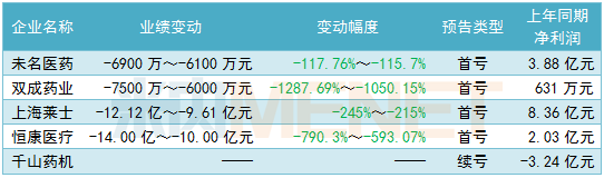 5家亏损企业中,除了千山药机1家续亏外,其余4家均是首亏,其中恒康医疗、上海莱士亏损金额或超10亿元。