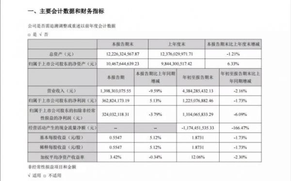 公司前三季度实现营业收入43.8亿元,同比减少2.16%,归属股东扣非净利润11亿元,同比减少6.09%;三季度单季公司实现营业收入13.98亿元,同比减少9.59%,归属股东扣非净利润3.24亿元,同比减少3.79%。